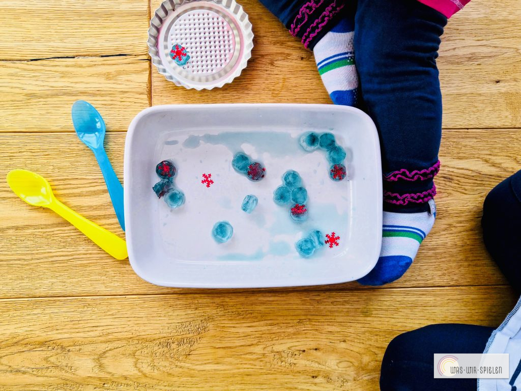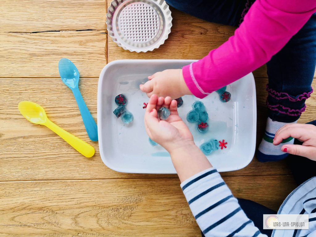 Man kann passend zur Jahreszeit oder zu einem Fest oder Anlass verschiedene Gegenstände einfrieren und so eine passende Spielidee kreieren.