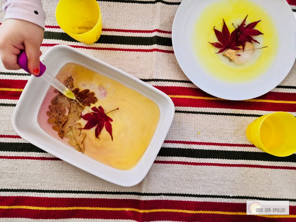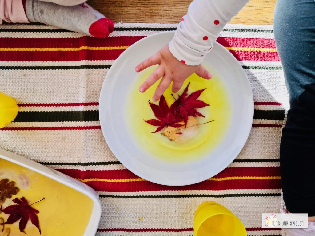 Hier war die Vorbereitung sehr einfach: wir haben einige Blätter beim Spaziergang gesammelt, diese auf Teller mit höherem Rand aufgelegt und mit Wasser bedeckt. Die Teller kamen über Nacht ins Gefrierfach und am nächsten Tag konnte gespielt werden.