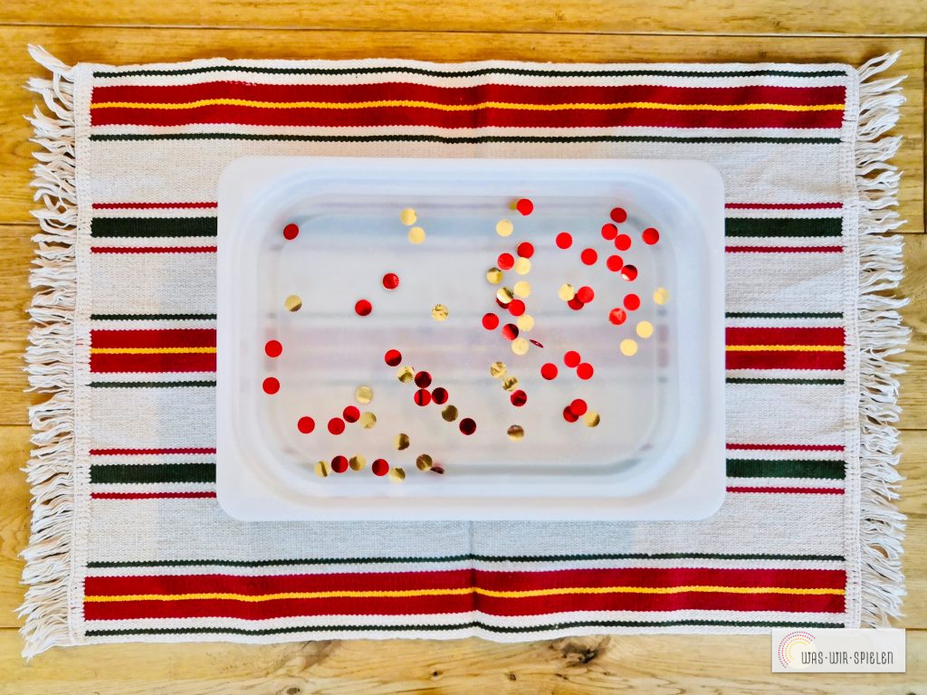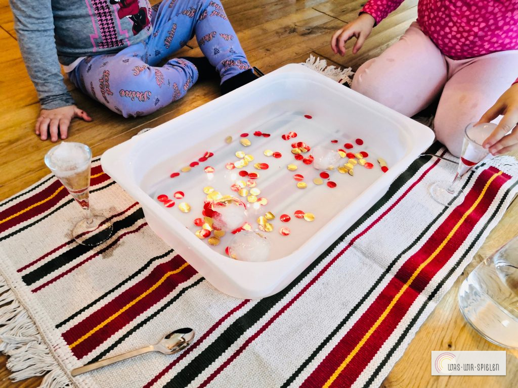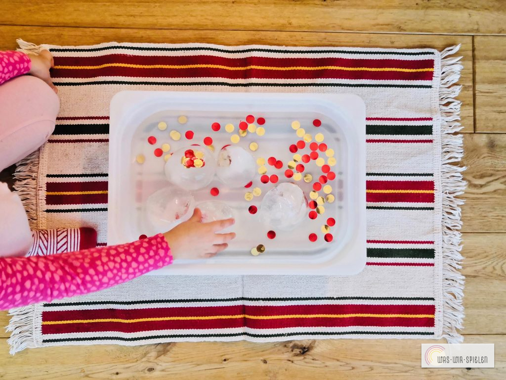 Nun haben wir eine Wanne mit Wasser und ein paar bunten Konfetti befüllt. Danach kamen die Eisbälle hinein. Die Mädchen bekamen Löffel zum Rühren und Spielen. Nach einer Weile halfen wir mit warmen Wasser nach. So schmolz das Eis schneller und nach und nach kamen die Konfetti frei.