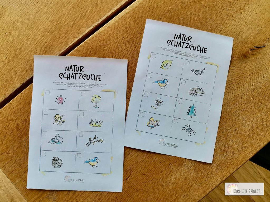 Hin und wieder überlege ich mir nette Spielchen oder Ideen für draußen – so wie unsere Natur-Schatzsuche. Sollten die Kinder einmal nicht zu einem Spaziergang zu motivieren sein – damit klappt es bestimmt!