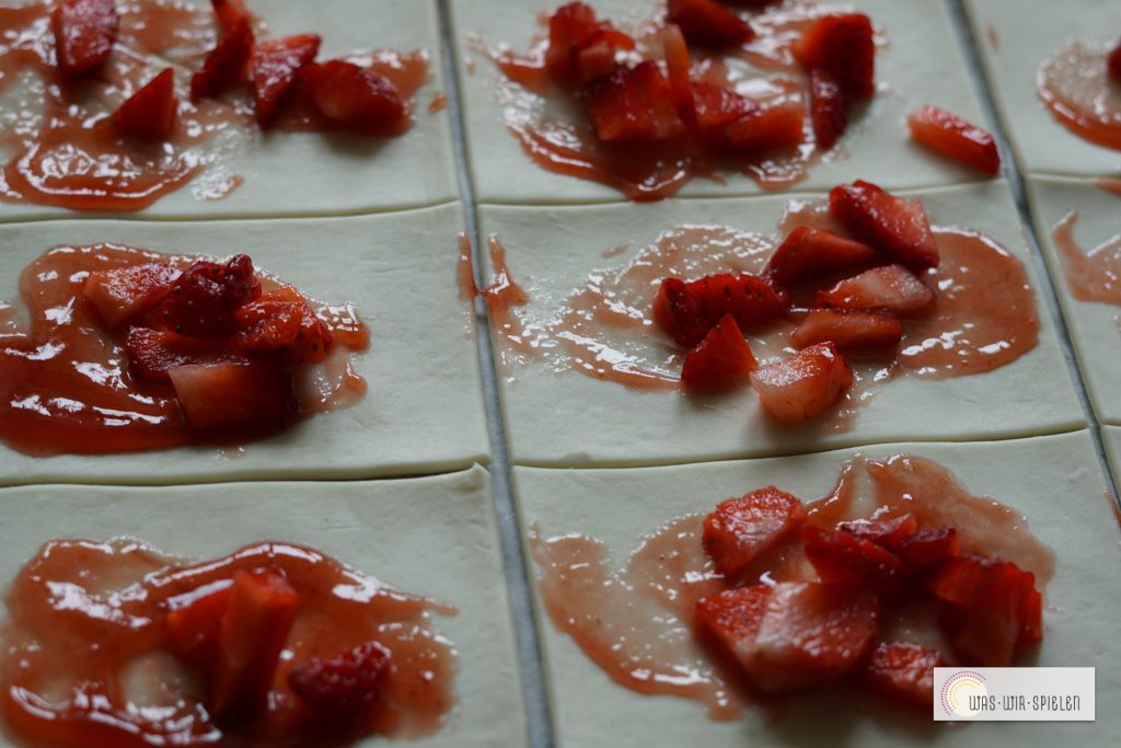Die Erdbeeren in kleine Stückchen schneiden. Die Schokolade fein hacken. Anschließend den Blätterteig in 16 kleine Rechtecke teilen, diese hauchdünn mit Marmelade bestreichen. (Achtung nicht an den Rändern) Nun die kleinen Erdbeerstückchen und die fein gehackte Schokolade auf den Rechtecken verteilen.