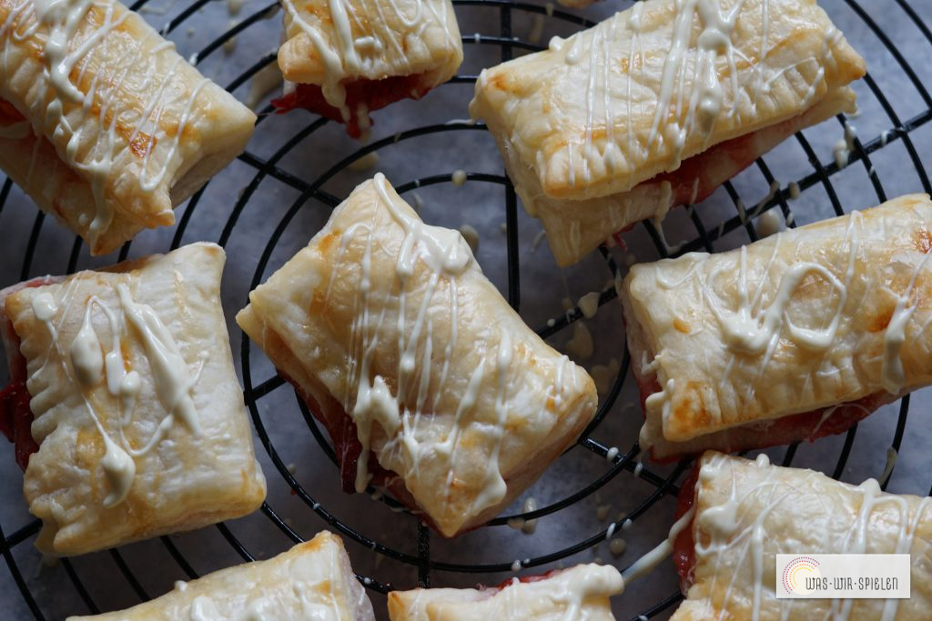 Diese zusammenklappen und mit Ei bestreichen. Auf einem, mit Backpapier belegtem Blech bei 180 Grad Heißluft circa 12 Minuten goldbraun backen und auskühlen lassen.