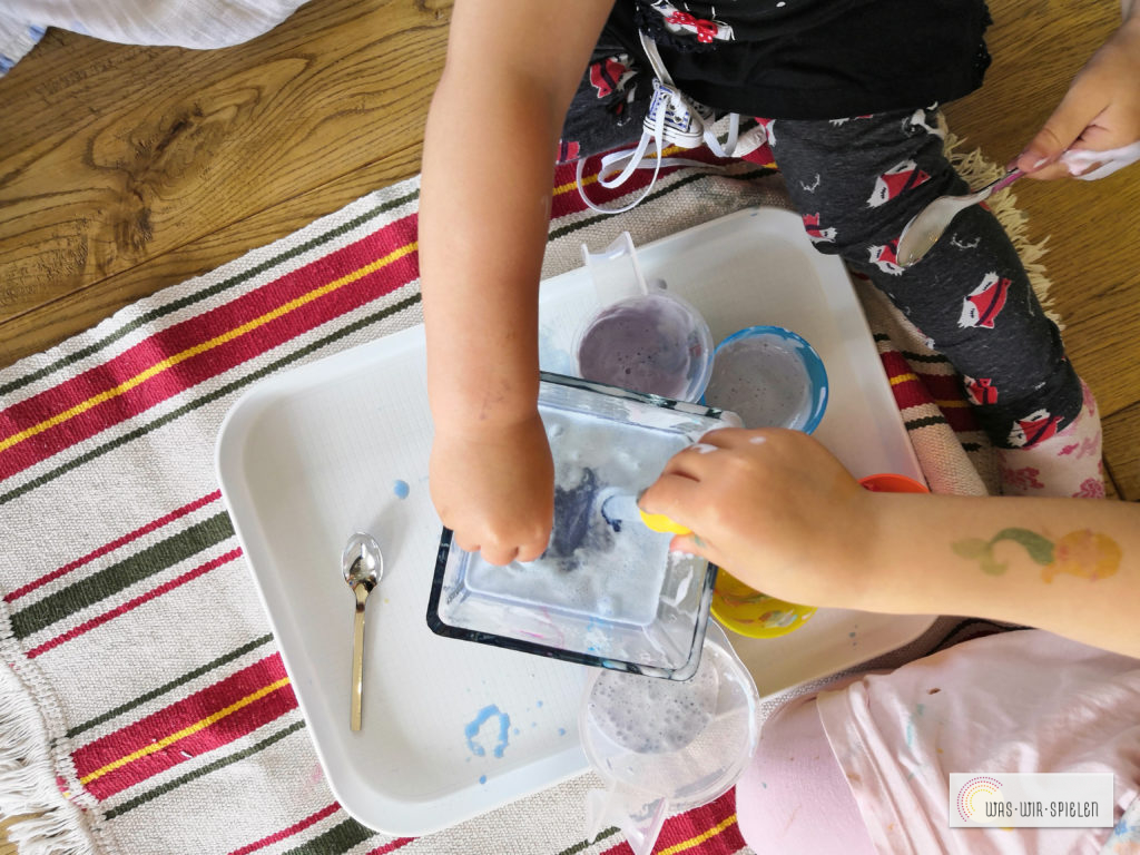 Man könnte das Gemisch auf einfrieren und für Spiele mit Eiswürfeln verwenden, wie zum Beispiel damit Malen, diese mit warmen Wasser und/ oder Salz schmelzen und so weiter!