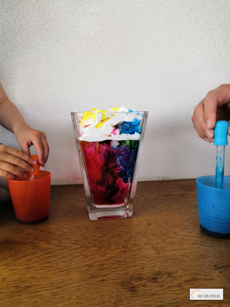Jetzt beginnt das große Staunen! Ihr saugt etwas buntes Wasser mit der Pipette auf und tröpfelt dieses dann langsam und Tropfen für Tropfen auf die Rasierschaumwolke. Die Farbe bahnt sich seinen Weg dann langsam durch die Wolke hindurch und wird darunter wieder sichtbar. Dort bildet es dann wunderschöne Formen, sobald es sich mit dem Wasser darunter vermischt.