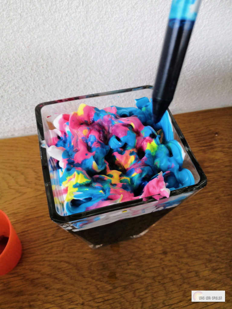 Dieses Wasser –Rasierschaum – Gemisch haben wir dann nach diesem magischen Experiment noch für ein paar Schüttübungen verwendet und nach einiger Zeit entsorgt. Tschüss, braune Suppe!