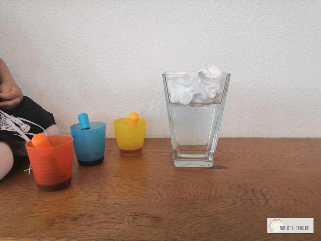 Zuerst füllt ihr einen Becher etwa 1cm voll Wasser und gebt ein bisschen Lebensmittelfarbe eurer Wahl hinein, die Farbe darf ruhig kräftig sein! Ihr könnt auch gern 2 oder 3 Becher mit verschiedenen Farben vorbereiten.