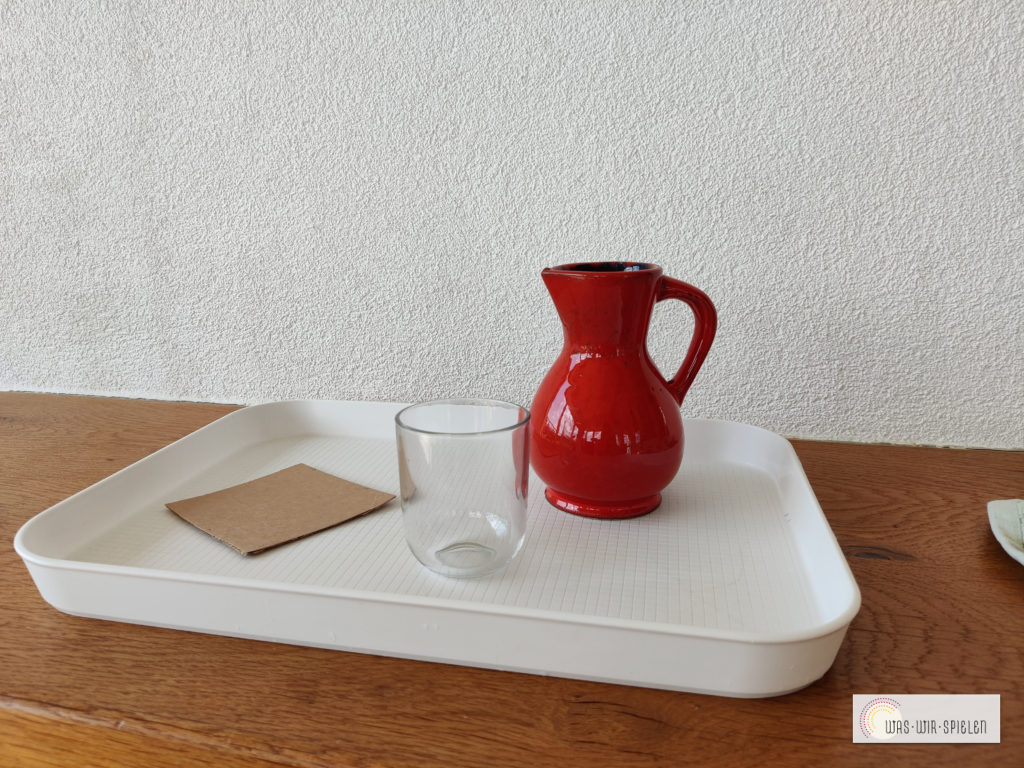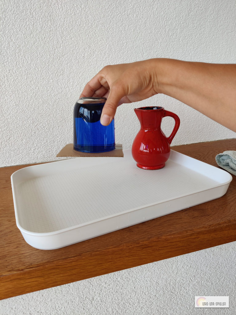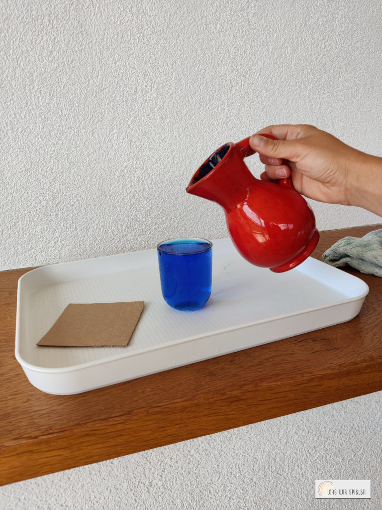 Verwendet unbedingt ein kleines Tablett als Unterlage oder probiert das Experiment über dem Waschbecken aus, falls beim Forschen etwas schief gehen sollte. Im Sommer ist dieses Experiment auch draußen ein echter Hit – Abkühlung inklusive!