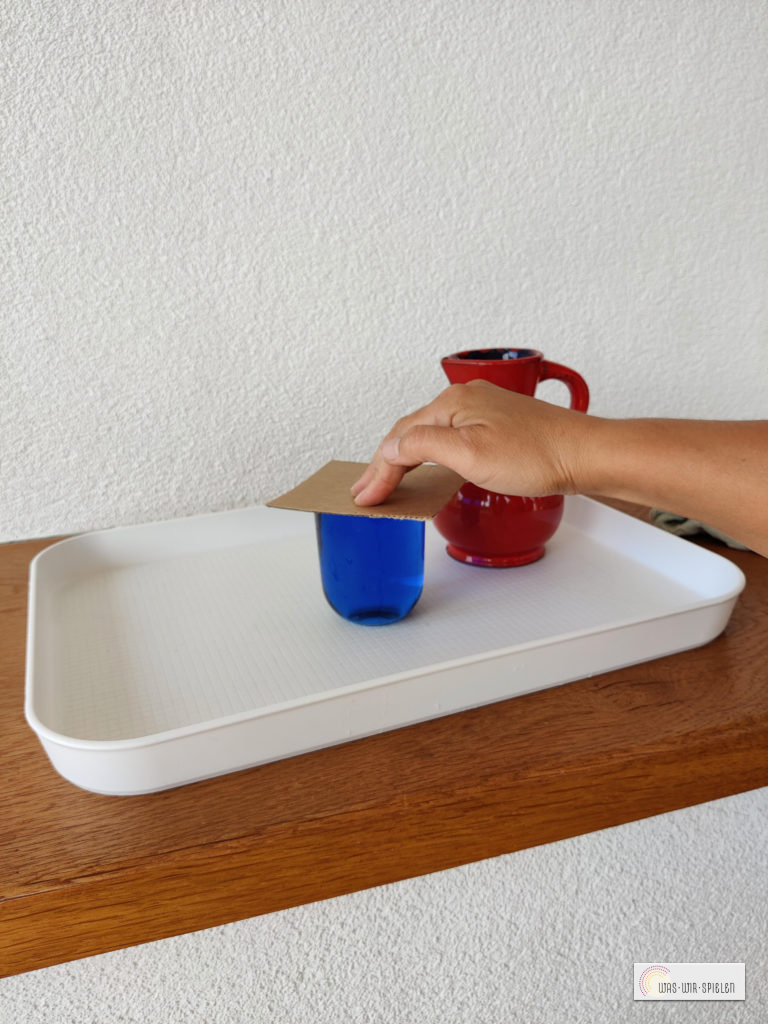 Man füllt ein Trinkglas voll Wasser und legt die Pappe darauf. Besonders eindrucksvoll ist der Versuch, wenn ihr das Wasser vorher mit einem Tropfen Lebensmittelfarbe einfärbt.