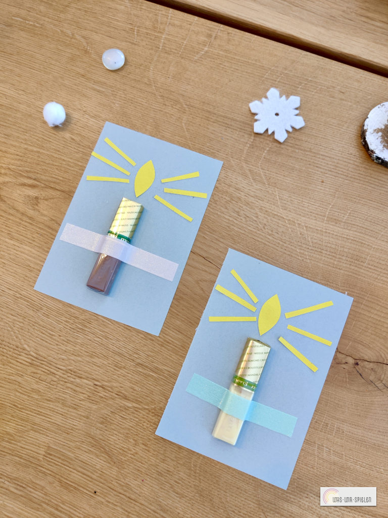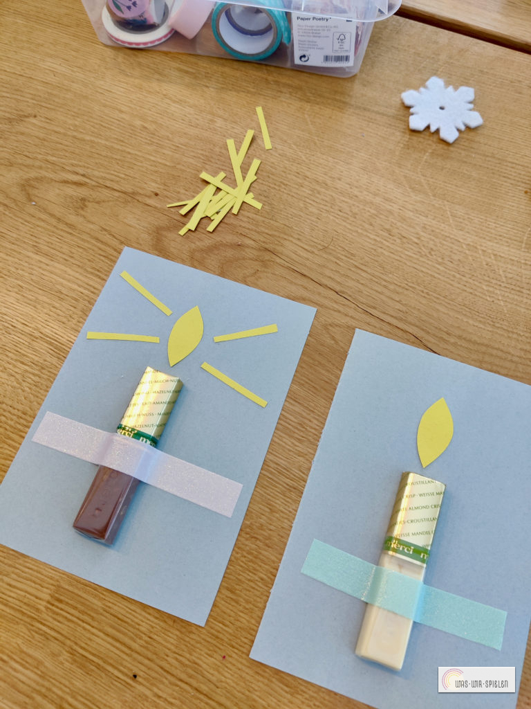 Zeichnet euch mit Bleistift eine Flamme und Strahlen auf dem gelben oder goldenen Tonpapier auf. Schneidet diese aus und klebt sie über die Praline. Schon ist die winterliche Karte fertig!
