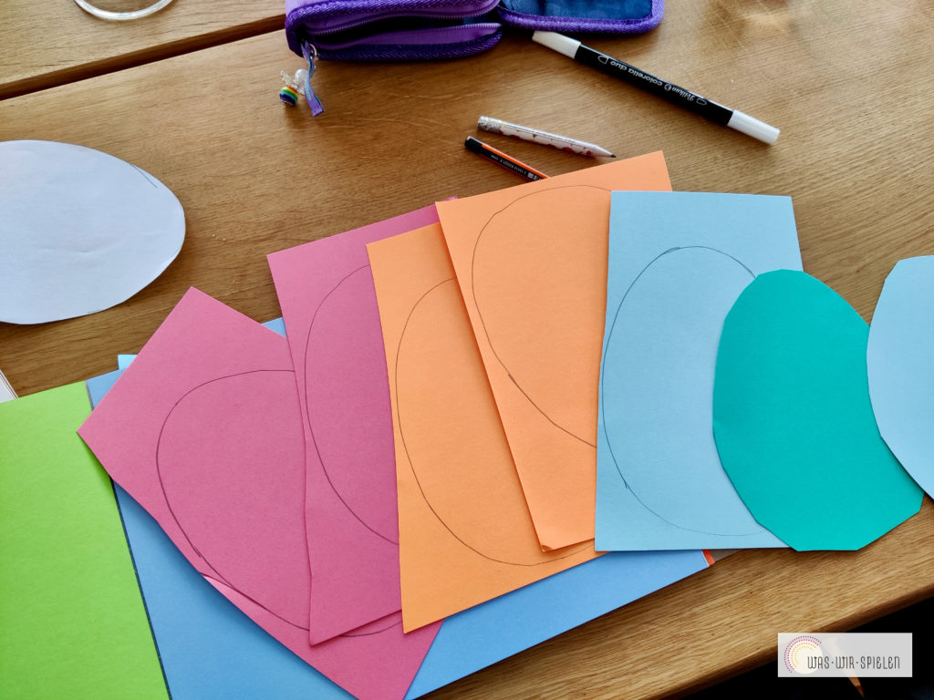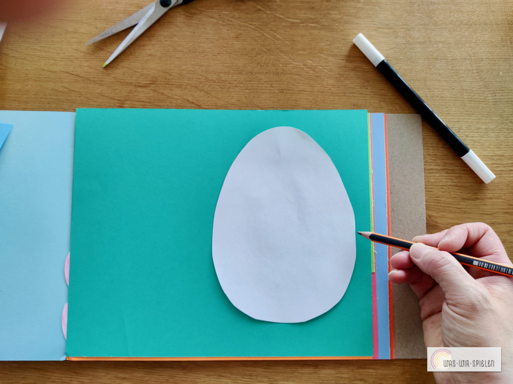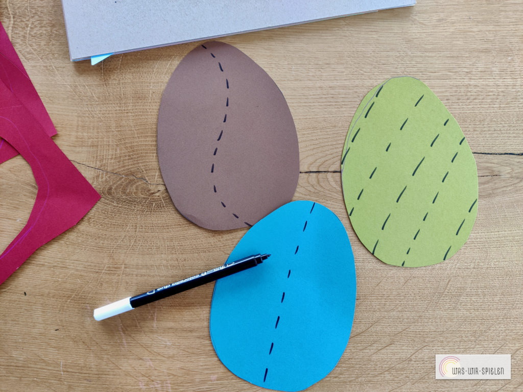 Bereitet euch eine Ei – Vorlage vor. Diese könnt ihr entweder freihändig zeichnen oder einen gratis Download nutzen. Ich finde die Vorlage von talu.de super praktisch.