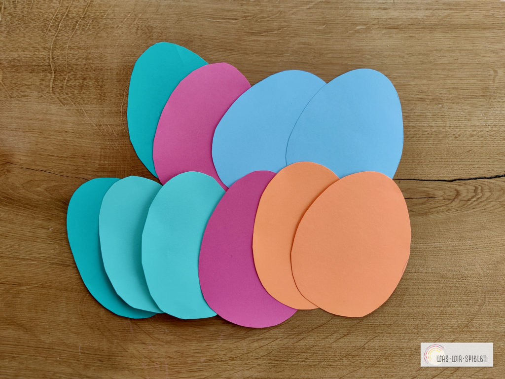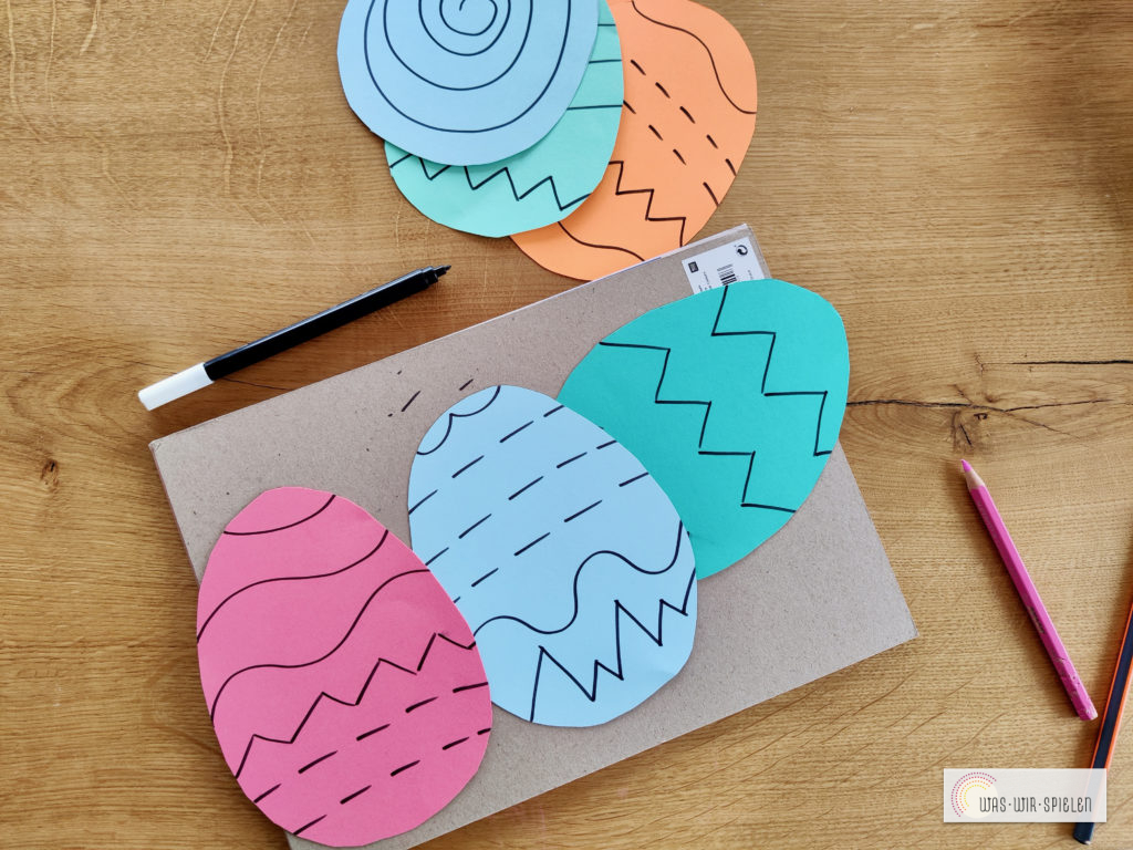Übertragt die Vorlage nun auf buntes Tonpapier und schneidet die Ostereier aus.