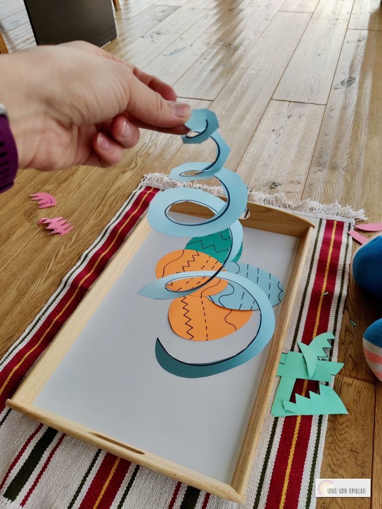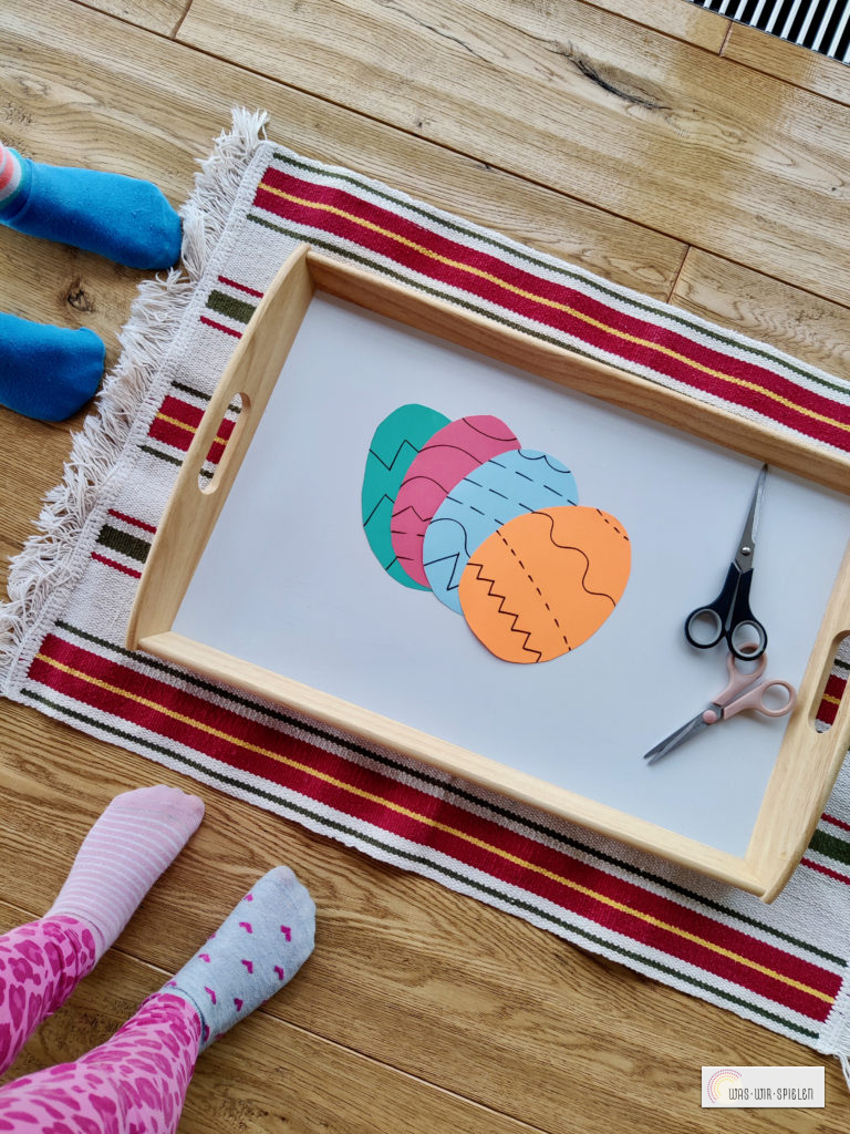 Die fertigen Schneide – Ostereier habe ich auf einem Tablett mit Scheren bereit gelegt. Die Kinder können nun nach Lust und Laune Ostereier schneiden und ihre Fähigkeiten trainieren.