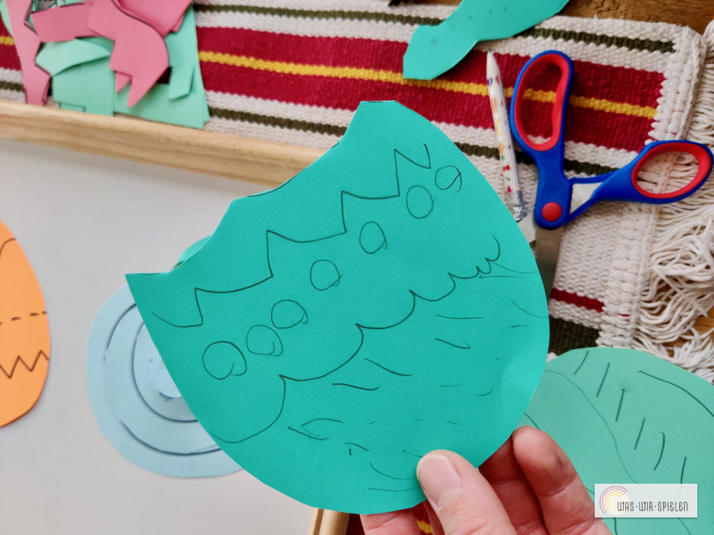 Malt anschließend mit einem schwarzen Stift Schneidelinien vor. Verwendet einfache Linien, wie etwa gerade Linien und langgezogene Bögen für Schneideanfänger. Für geübte Kinder eignen sich Zick-Zack Muster, Wellen und Spiralen.