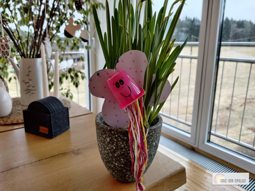 Stich nun mit dem Draht oder mit einer Nadel 2 kleine Löcher oben in den Becher, stecke den Draht hinein und klebe ihn mit der Heißklebepistole fest. Zum Schluss klebst du noch die Flügel hinten auf den Becher und schon kann euer kleiner Paradiesschmetterling fliegen!