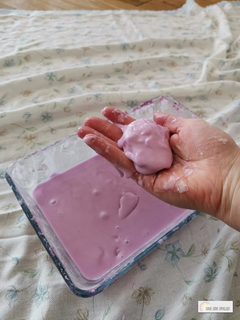 Tipp: Vor dem Spielen Hände waschen, so gelangen weniger Keime in die Masse und sie bleibt länger haltbar. Im Kühlschrank hält sie einige Tage. Sollte sie während der Lagerung zu fest geworden sein, einfach etwas Wasser beimengen.