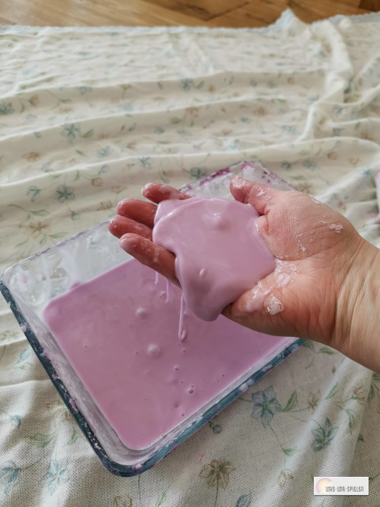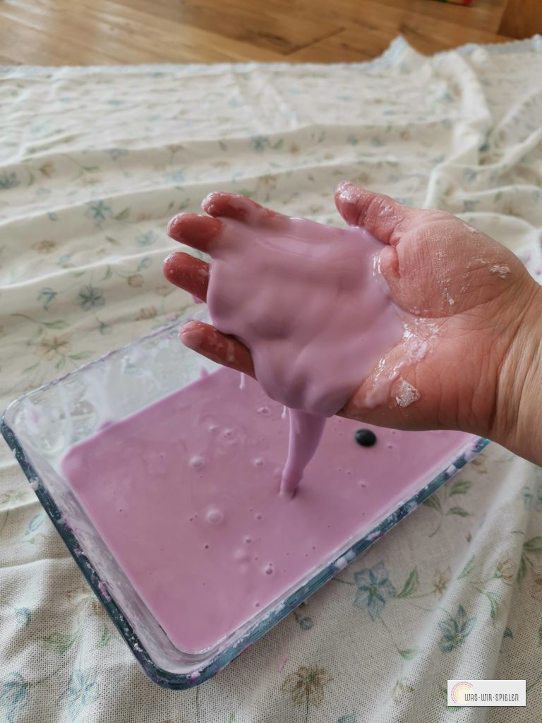 Es kann bei der Erstellung nichts schief gehen – triffst du die Konsistenz nicht ganz, gib einfach löffelweise Wasser hinzu, sollte die Masse zu fest sein. Oder versuch es mit etwas mehr Stärke, wenn euer Oobleck zu flüssig ist.