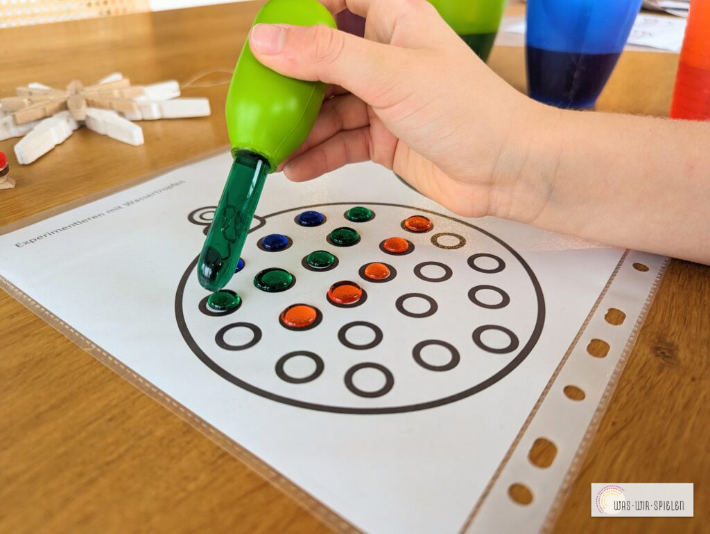 - Beobachten, wie die Tropfen bunte Wasserberge bilden.