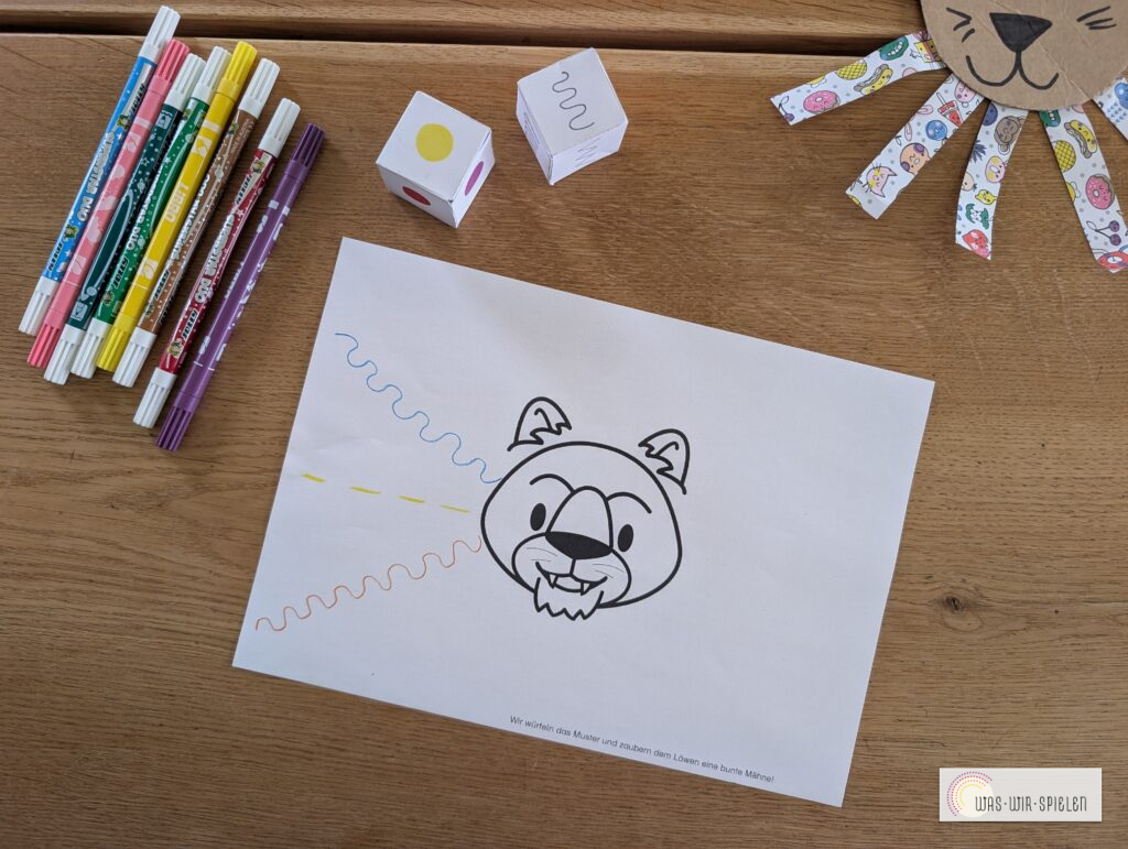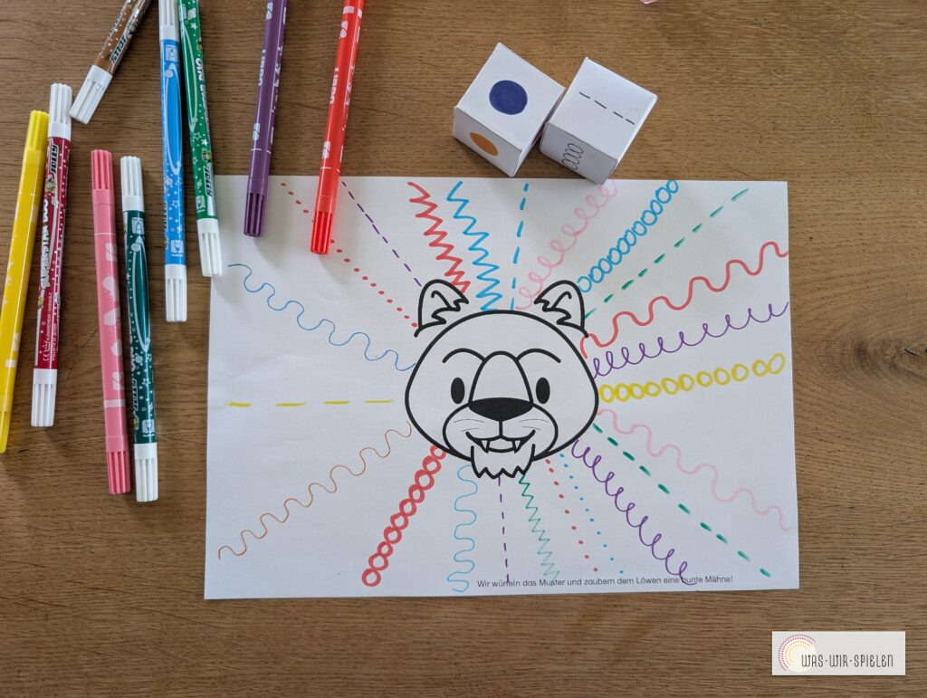 An dieser Station konnten die Kinder einem Löwen auf einem Arbeitsblatt eine bunte Mähne zeichnen – aber nicht einfach so – sondern spielerisch mit zwei gebastelten Würfeln:
