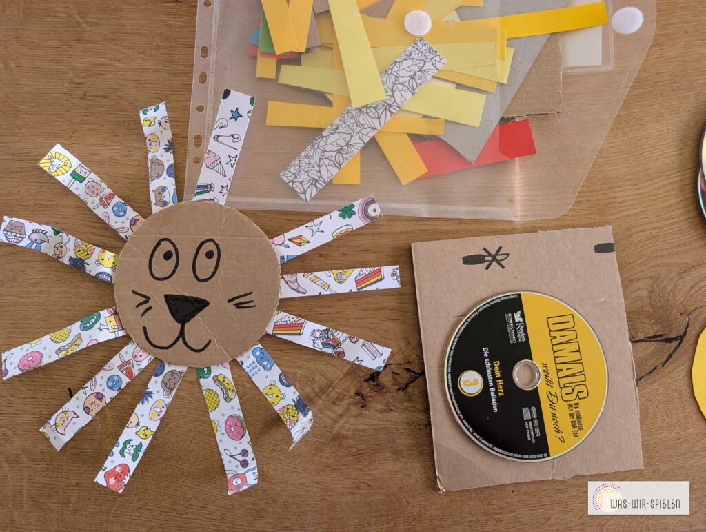 Mithilfe alter CDs haben wir runde Löwenköpfe aus Pappe und Tonpapier geschnitten. Die Kinder malten liebevoll Augen, Nase und Schnauze auf und klebten dann viele bunte Papierstreifen rundherum – als wilde, wuschelige Mähne. Eine einfache, aber effektvolle Bastelidee, die sofort als Erinnerung mit nach Hause durfte.